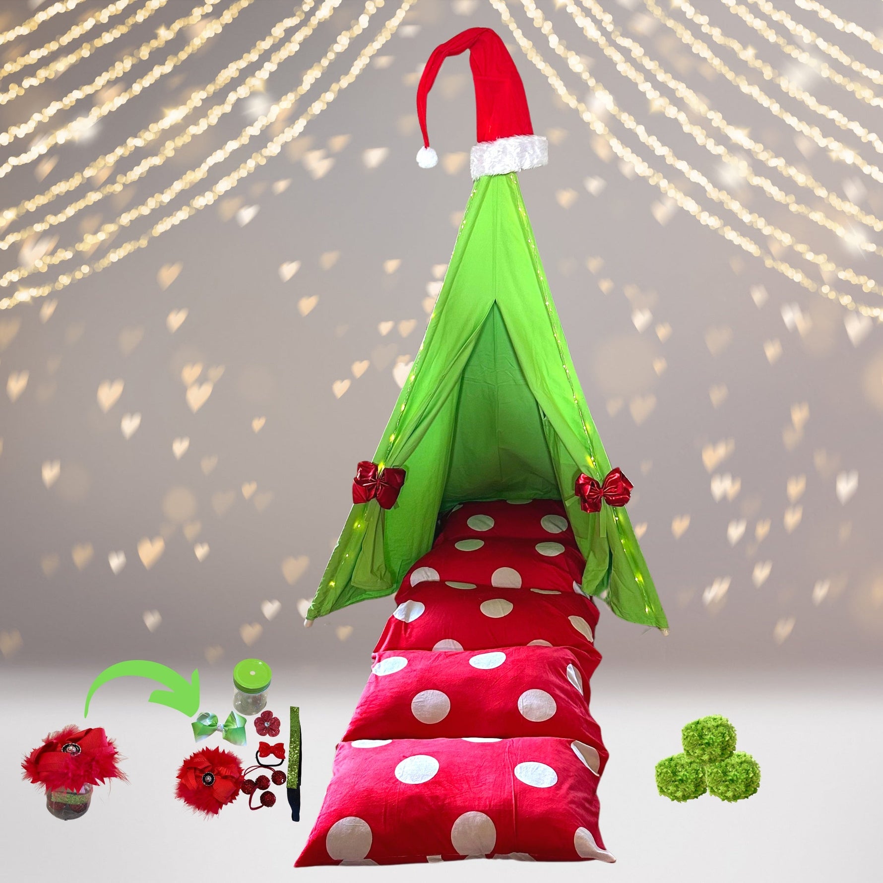 If you're on the lookout for unique gift ideas for your daughter be it for Christmas or a holiday birthday presents, look no further than our Kids Christmas Tent Gift Set! It comes complete with a play teepee tent, pillow bed case, whimsical Santa hat, big red metallic bows for the doorway of the tent, fuzzy green snowballs that are perfect for playing snowball fight and toss games outside, and a treat jar filled with hair accessories. She'll love spending time in her own personal Christmas oasis created just for her! She will absolutely love waking up Christmas morning to find a bright lime green teepee tent decked out with girls bows and a whimsical Santa hat. She will love her slumber party for one this holiday season, it will the the perfect present.