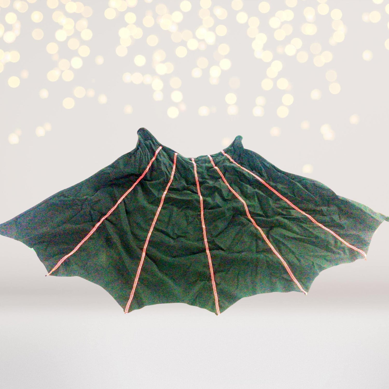 Our bat cape features striking red stitching against a pitch-black background, creating a dramatic and eye-catching design. With its bat-like silhouette and flowing fabric, this cape is perfect for swooping through the backyard, taking on imaginary villains, or even just lounging around the house in style.