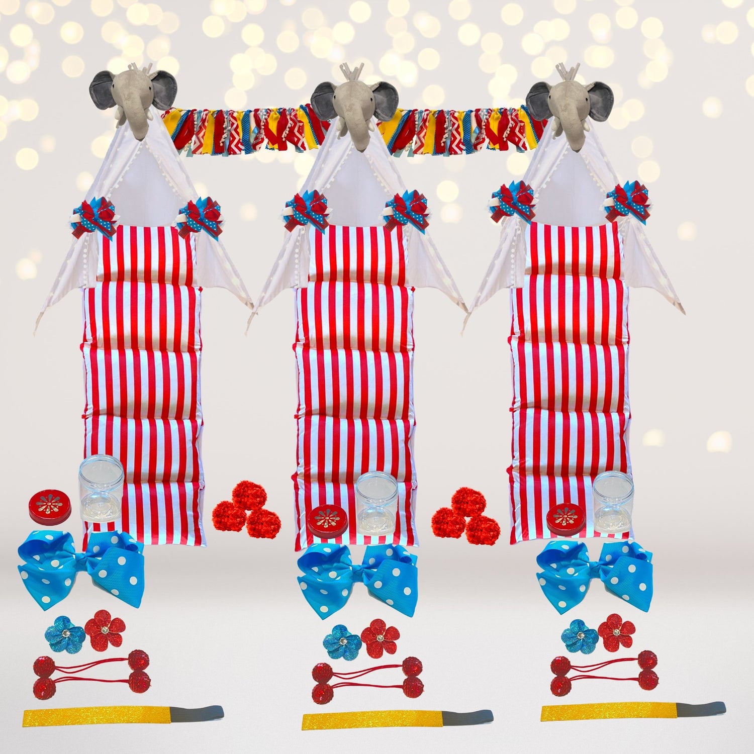 - 3 coordinating hair bows to clip at the tent door tie backs