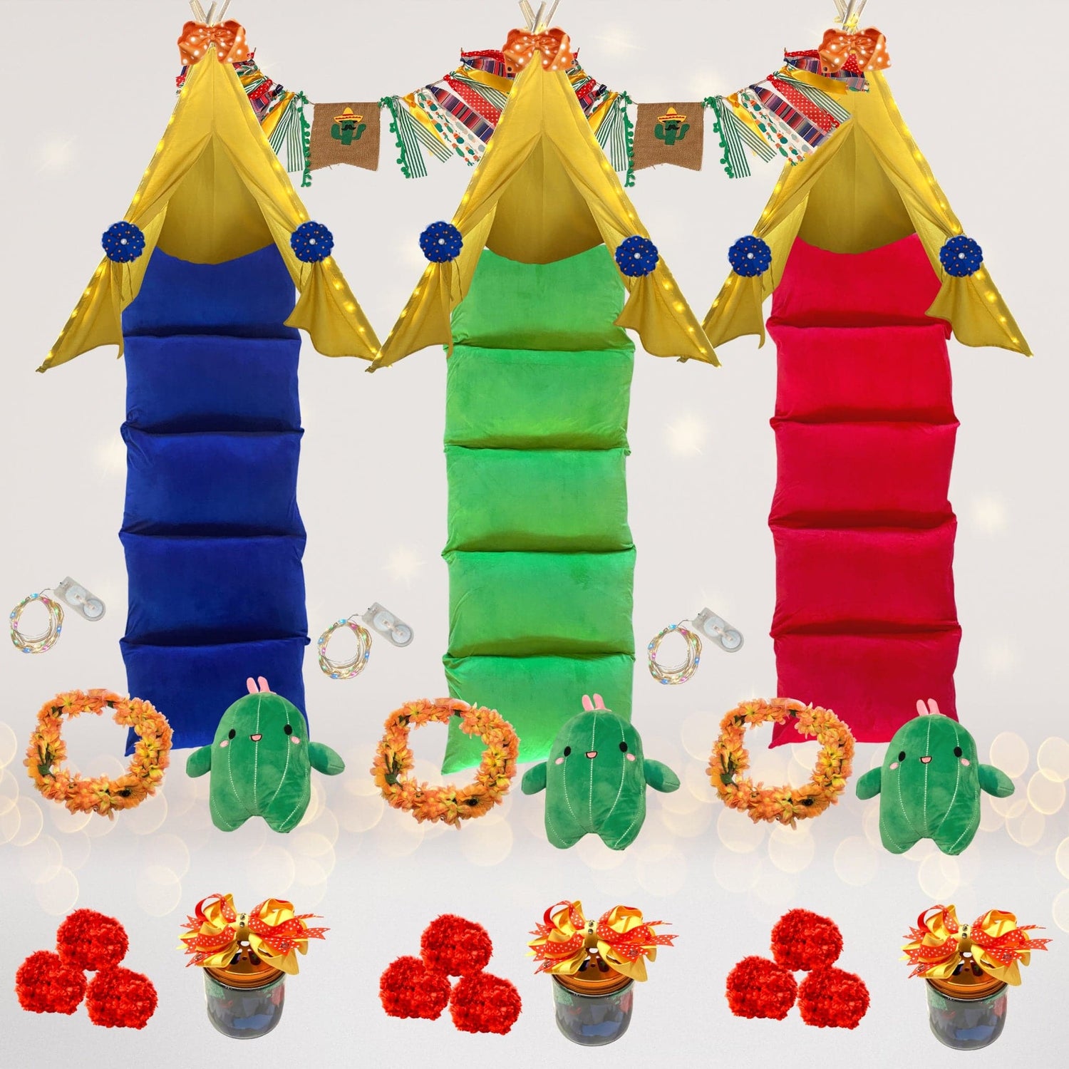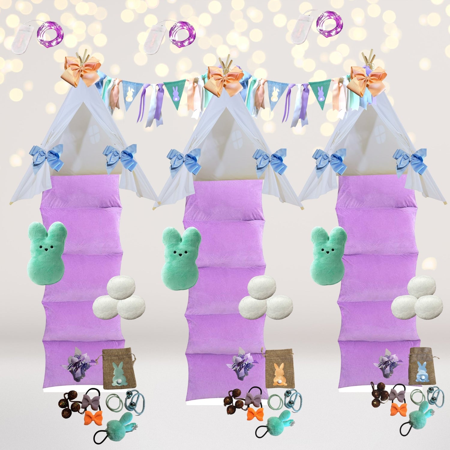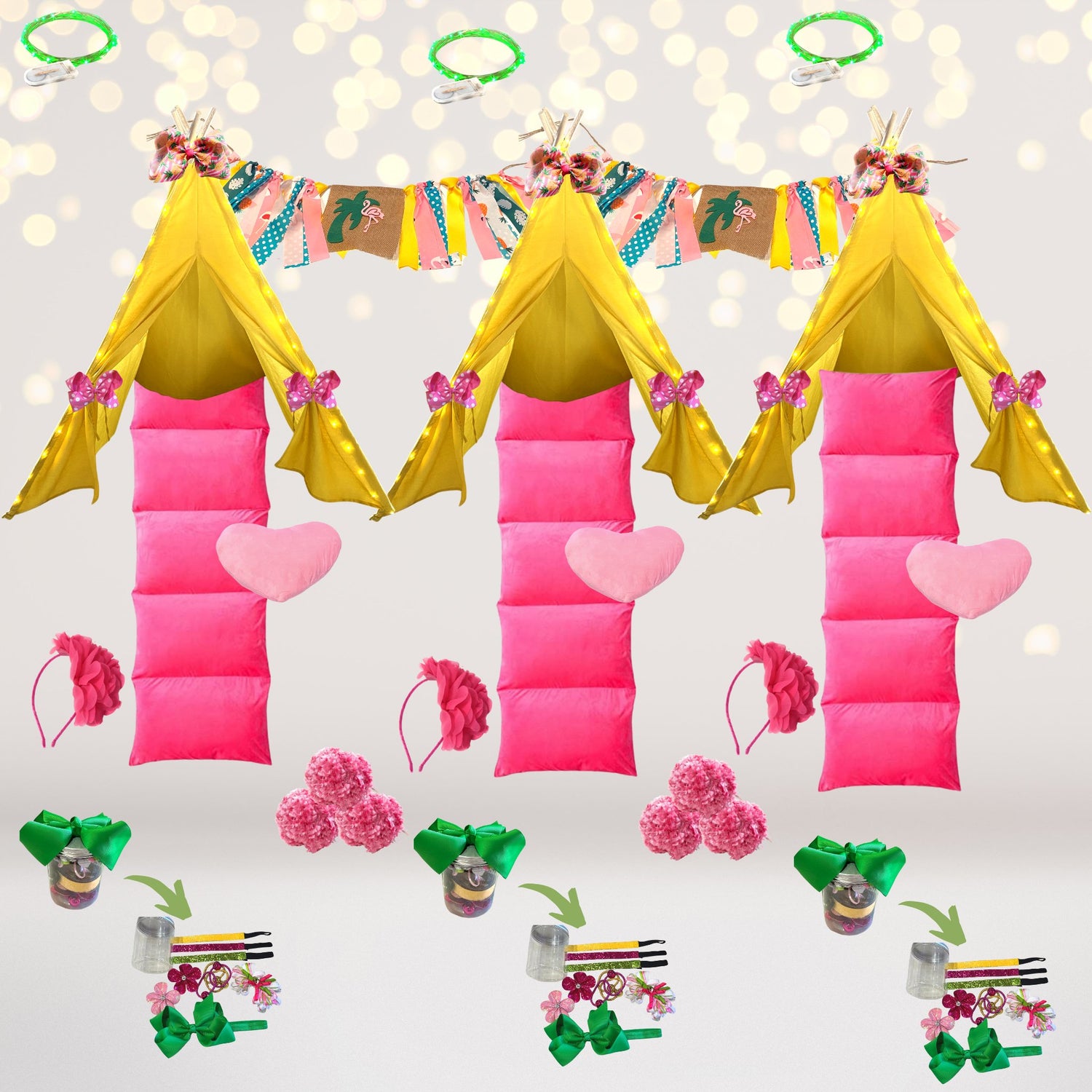 Glamping Teepee Tents: Each box includes 3 large lace glamping teepee tents, complete with screw-together poles and a coordinating carry bag. Decorate the tents with the provided fairy lights and themed bows for an enchanting sleepover setting. ⛺✨🌜