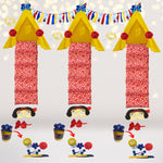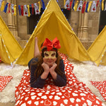 The Apple Princess Party Set allows you to decorate for your child's Apple Princess Glamping Slumber Party, while utilizing the party favors your guests will take home. The 3 Yellow Teepees give the party a pop of color. When you add the Fairy Lights to the front of each of them, you will see how enchanting they will look once the lights are turned down. You will want to add the Red, Yellow, Royal Blue, and Pale Blue with Glittering Red Apples, Ribbon Banners to connect your "party houses" in colorful beauty. As a final touch, tieback the entrance of the Tee Pees, and use the Red Marabou Feather Flower Shaped Boutique Bow Clips, to brighten the tiebacks on either side of the Tee Pee.