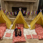 - Each bright yellow birthday party play tent features a premium 100% Cotton canvas cover with teepee window for your child to look out into the world around them or imagine new and far away places. Additionally, each kids teepee canvas cover is made with 2 spacious pockets under the window for storing those most precious toys to your child, be it his or her favorite book or stuffed animal. Our play house is perfect for indoor play, however is rugged enough to go for an outdoor play adventure as well. We just don't recommend leaving it outside overnight.