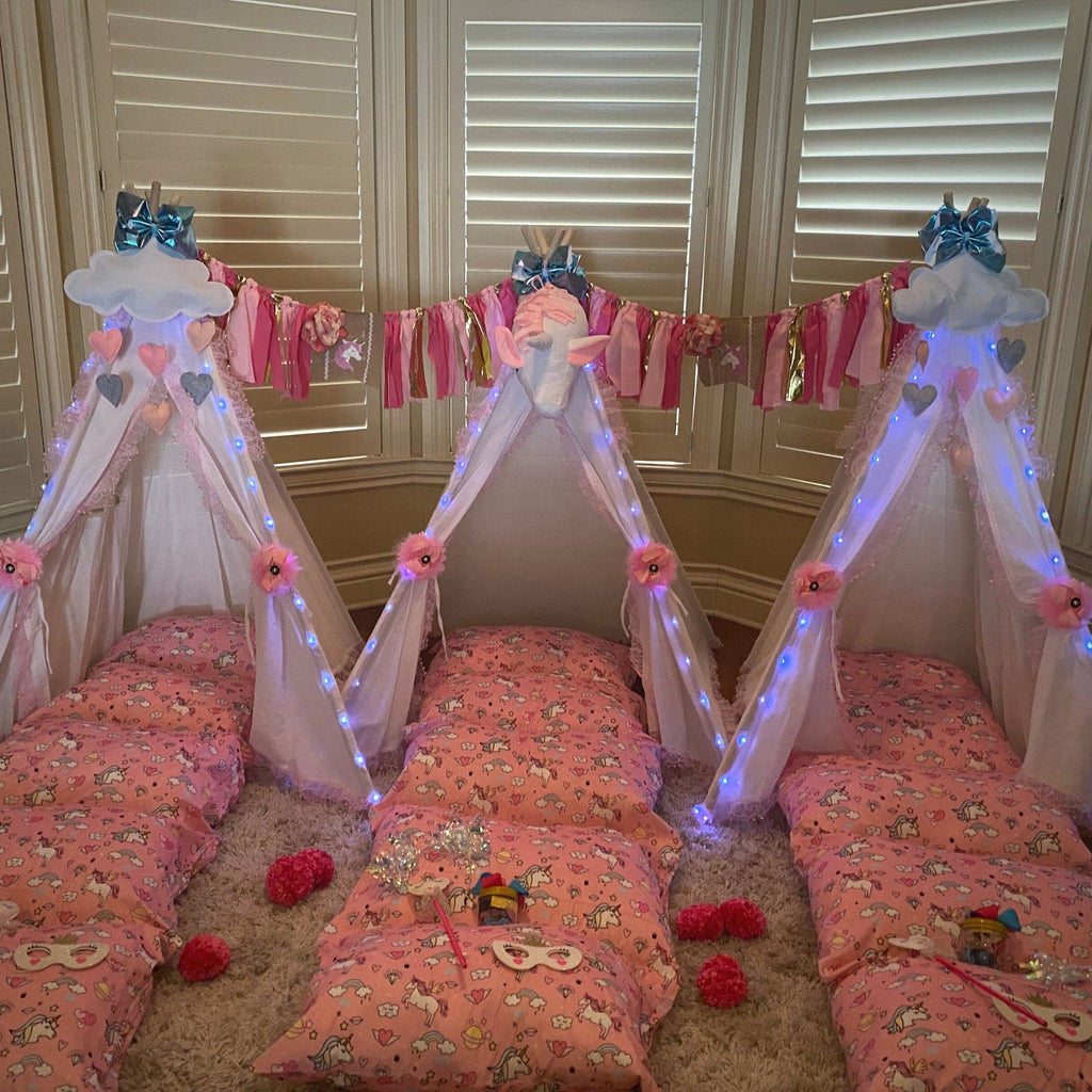 - Magical Teepee Tents: Easy-to-assemble unicorn teepee tents that offer a private, fairy-tale space for each guest.