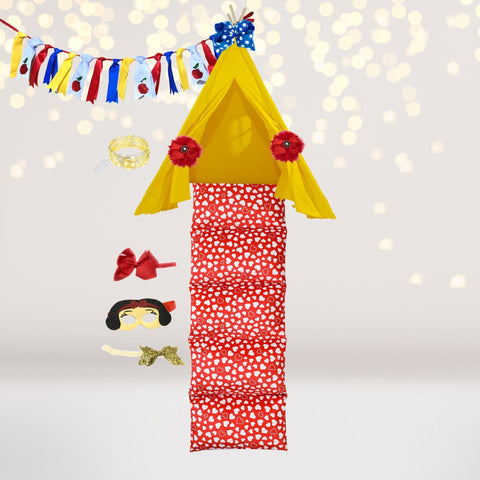 Celebrate your daughter this holiday season with our Kids Christmas Tent Gift Box Set! It makes the perfect Christmas or birthday present and includes a play A-frame tent, pillow bed case, whimsical elf hat, fuzzy red snowballs that are perfect for playing snowball fight and toss games outside, and a treat jar filled with hair accessories. She will love spending time in her own Christmas-themed oasis created just for her! She will be elated to wake up on Christmas morning and find a red play tent adorned with a whimsical elf hat. This holiday season, your special girl will enjoy the best slumber party of all -- by herself! Watch her fall asleep with a big Christmas smile on her face.