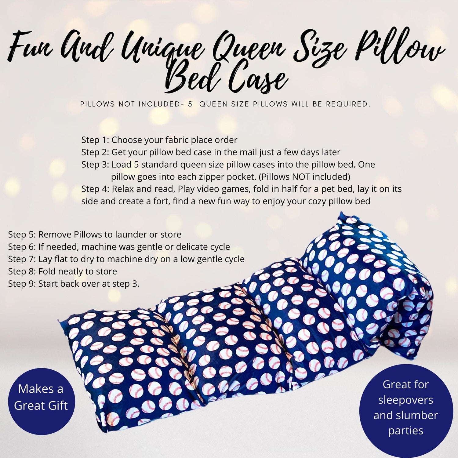 - This versatile pillow bed will transform any space into an immediate sleepover or baseball party. It is great for birthday celebrations, campouts, and travel. Your child will enjoy napping, building forts, watching cartoons, reading books, and playing with pets on this cozy, colorful pillow bed slipcover. Your teen will find the lounger comfortable for studying by the fireplace, listening to music, playing video games, or talking on the phone. It makes a quick, portal extra bed for hotel stays, camping, and sleepovers at grandma's house.