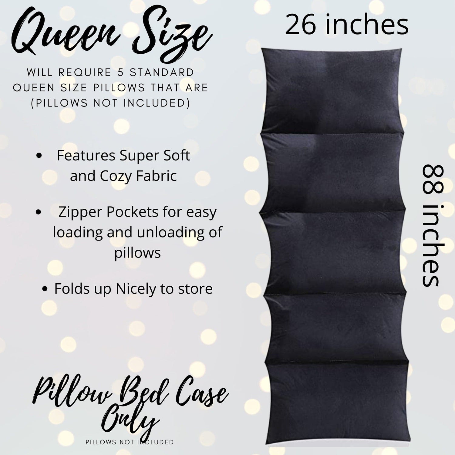 - You will need to provide 5 standard queen size pillows and load 1 pillow into each zipper pocket. When you are done its easy to unload and wash or fold up and put away. This pillow bed pillow fits 5 standard queen size pillows and is 26 inches wide by 88 inches long.