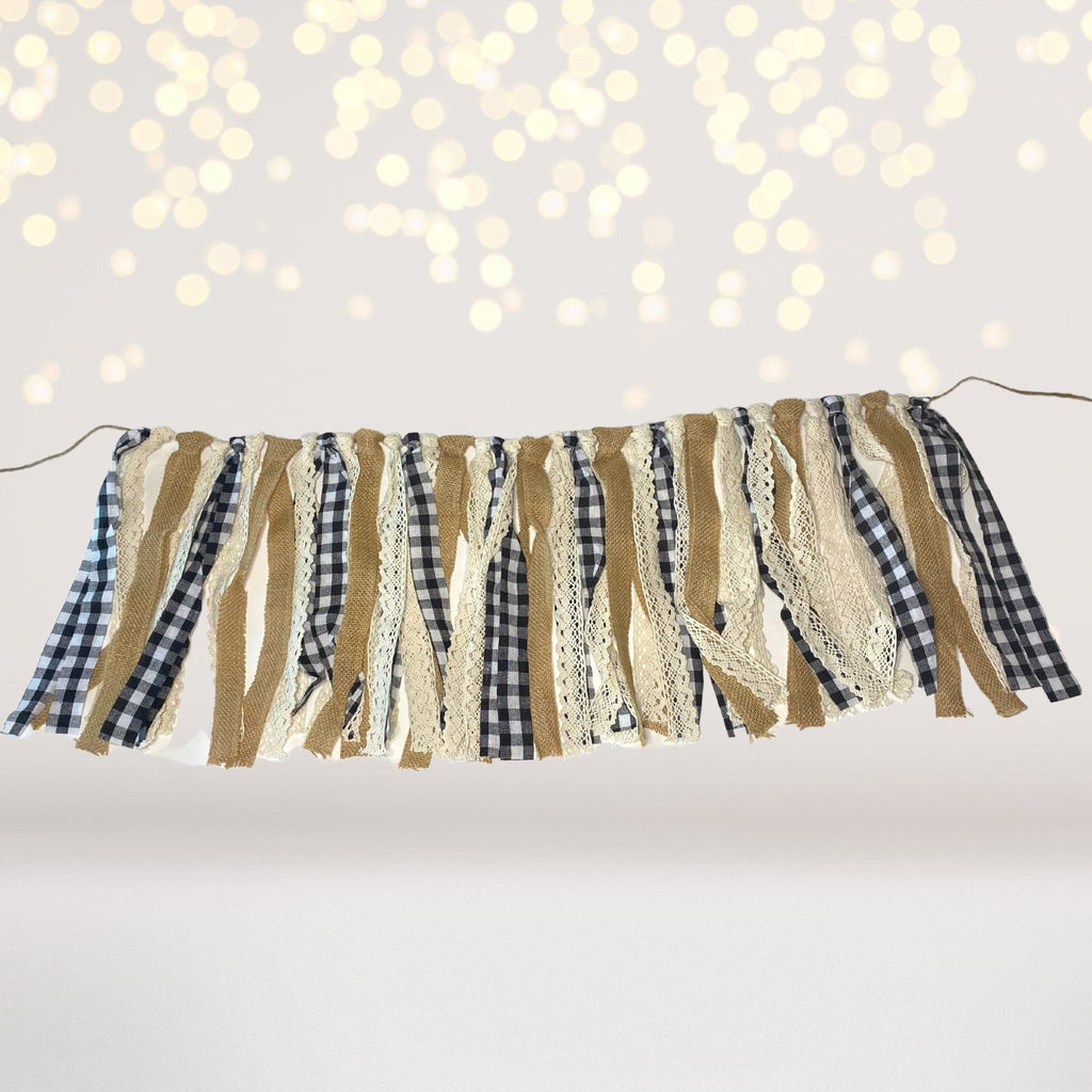 Our banner features a classic buffalo plaid pattern in timeless black and white. This striking design is paired with delicate lace and burlap accents, creating a trendy and unique look that's sure to impress your guests.